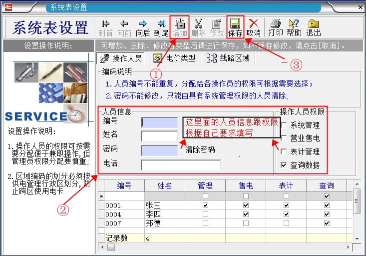 系統(tǒng)默認的管理人員有“張三、李四、德邦、管理員”。 其中“管理員”是最高權限擁有者,不能刪除。其它人員能夠隨意刪除增加。