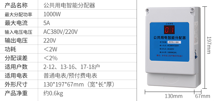 一、智盛牌公用電智能分配器”是將公共樓道用電所消耗的電能(如樓道燈,對講防盜門等),自動分配到各受益用戶的電表中。每天輪流接通一戶電表,開機通電時第一戶電表隨機產生,達到公平分攤電費的目的,本款公共用電智能分配器特點:內置小型空開,過載短路直接切斷,避免頻繁更換保險絲